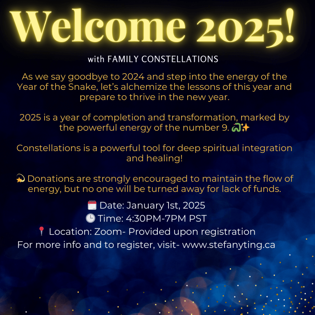 🌞WELCOME 2025!✨ ← BackThank you for your response. ✨ As we say goodbye to 2024 and step into the transformative energy of the Year of the Snake, let’s come together to alchemize the lessons of this year and prepare to thrive in 2025 – a year of completion and transformation, marked by the powerful energy of the number 9. 🐍✨ 2025 calls for release, completion, and new beginnings, and with the support of Family Constellations, we’ll tap into the power of our ancestors to help us heal and align with our highest potential. This practice honors the wisdom and energy of those who came before us, creating deep healing and support for the path ahead. Join Stef and Barb for an evening of deep healing with family constellations, which will include constellation exercises and alchemy to promote deep healing + transformation into 2025.💫 Donations are strongly encouraged to maintain the flow of energy, but no one will be turned away for lack of funds. Donations can be made here: https://paypal.me/stefanyting Name(required) Email(required) Would you like to receive a constellation on New Years Day 2025?(required) Send RSVPSubmitting form Δ Donation$15.00