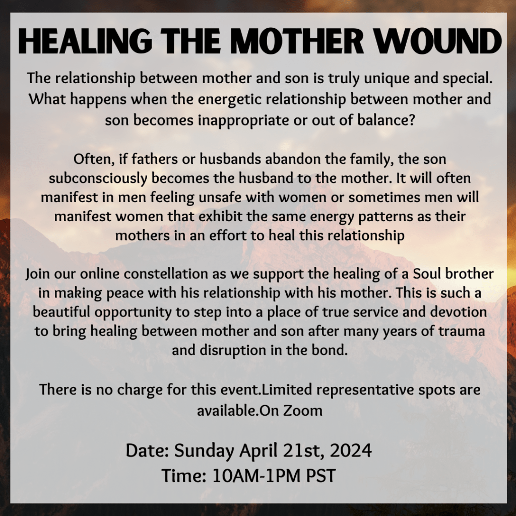 Healing the Mother Wound (Mother-Son Relationship) ← BackThank you for your response. ✨ Name(required) Email(required) Attending?(required) April 21st, 2024- Online Mother Wound Constellation Send RSVPSubmitting form Δ